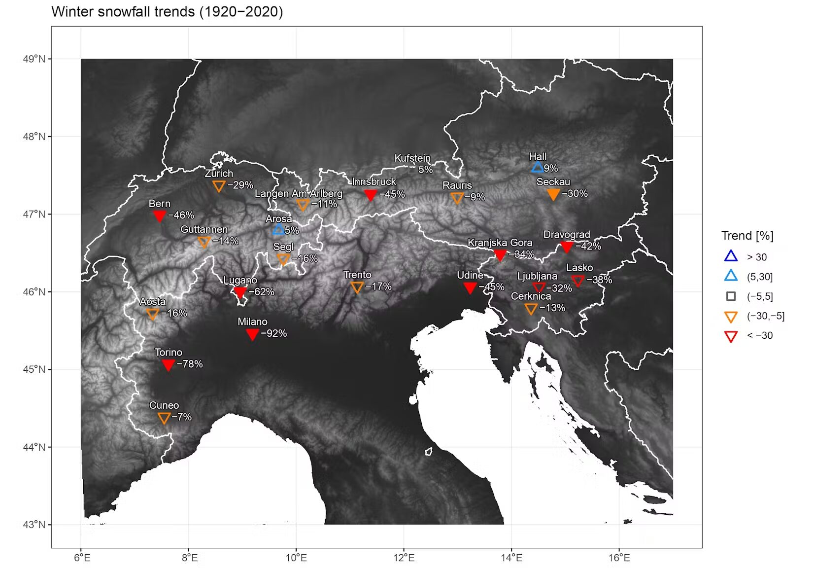 Die Studie wurde im International Journal of Climatology veröffentlicht und vom Eurac Research Institute durchgeführt. In der umfassenden Studie wurden Daten von 46 Orten im Alpenraum analysiert. Die Daten im Zeitraum von 1920 bis 2020 wurden genau untersucht. Die wichtigsten Schlussfolgerungen: Die südwestlichen Hänge sind mit einem Rückgang von fast 50 % besonders stark betroffen. Auch an den Nordhängen der Alpen ist der Schneefall deutlich zurückgegangen. Allerdings weniger dramatisch, mit einem Rückgang von 23 %.