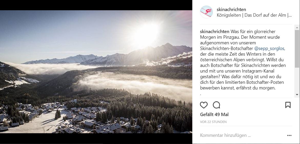 Skinachrichten.de hat sich zum Ziel gesetzt, jeden Tag seine Leser zum Thema Skifahren zu informieren und über viele weitere, spannende Geschichten in den Bergen zu berichten. Skinachrichten auf Instagram startet ab heute sein Botschafter-Programm für die Skisaison 2017/2018 und gibt Menschen die Möglichkeit mit zu gestalten und mit zu informieren. Wie ein Beitrag auf Instagram, inklusive des Skinachrichten-Botschafters aussieht, ist im folgendem Bild zu erkennen: